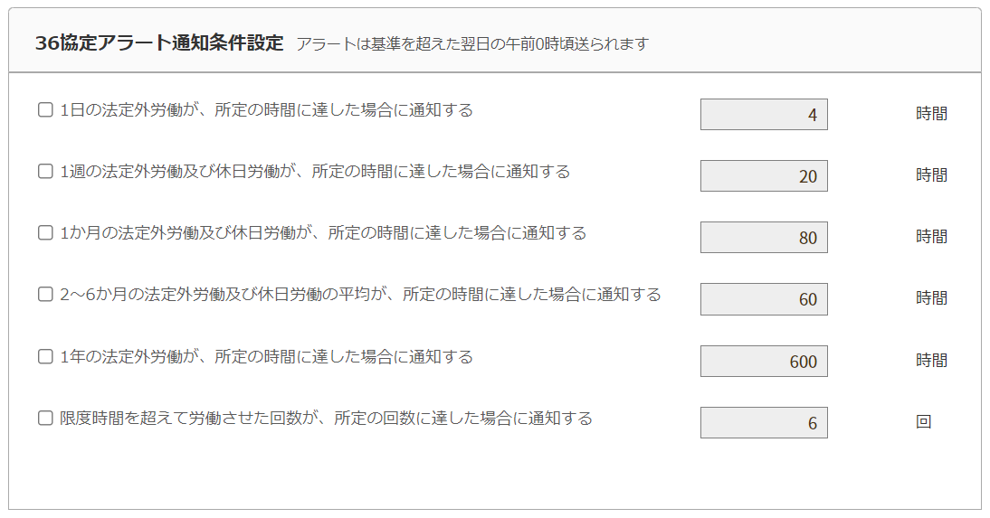 2. 「 36協定アラート通知条件設定」で通知したい項目にチェックを入れ、時間数を設定する