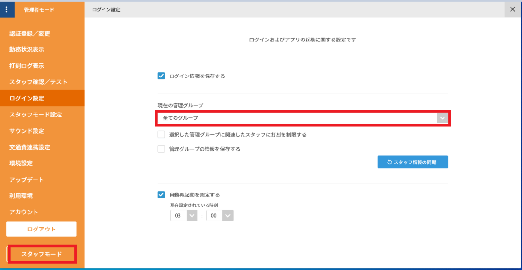 2. 管理者モード内「ログイン設定」→「現在の管理グループ」で打刻場所にしたいグループを選択する