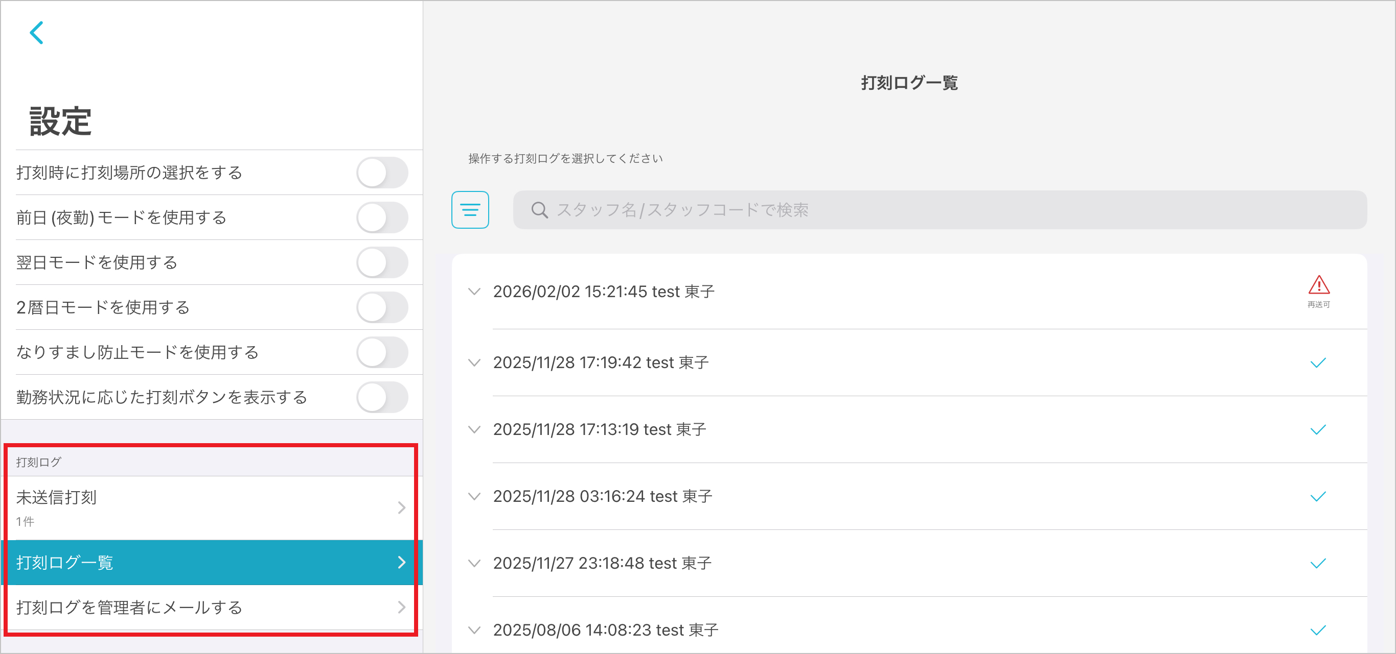 設定→打刻ログ→未送信打刻
