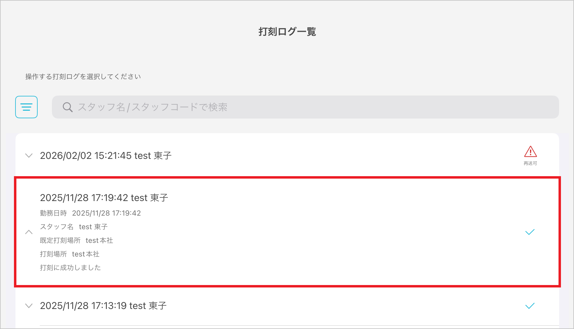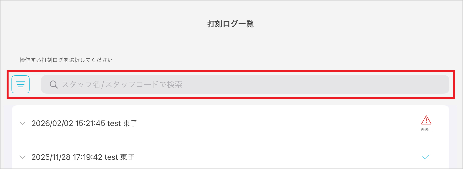 | スタッフ名 | 入力した文字列が含まれるスタッフ名を探し、該当するスタッフの打刻ログを表示します。 |