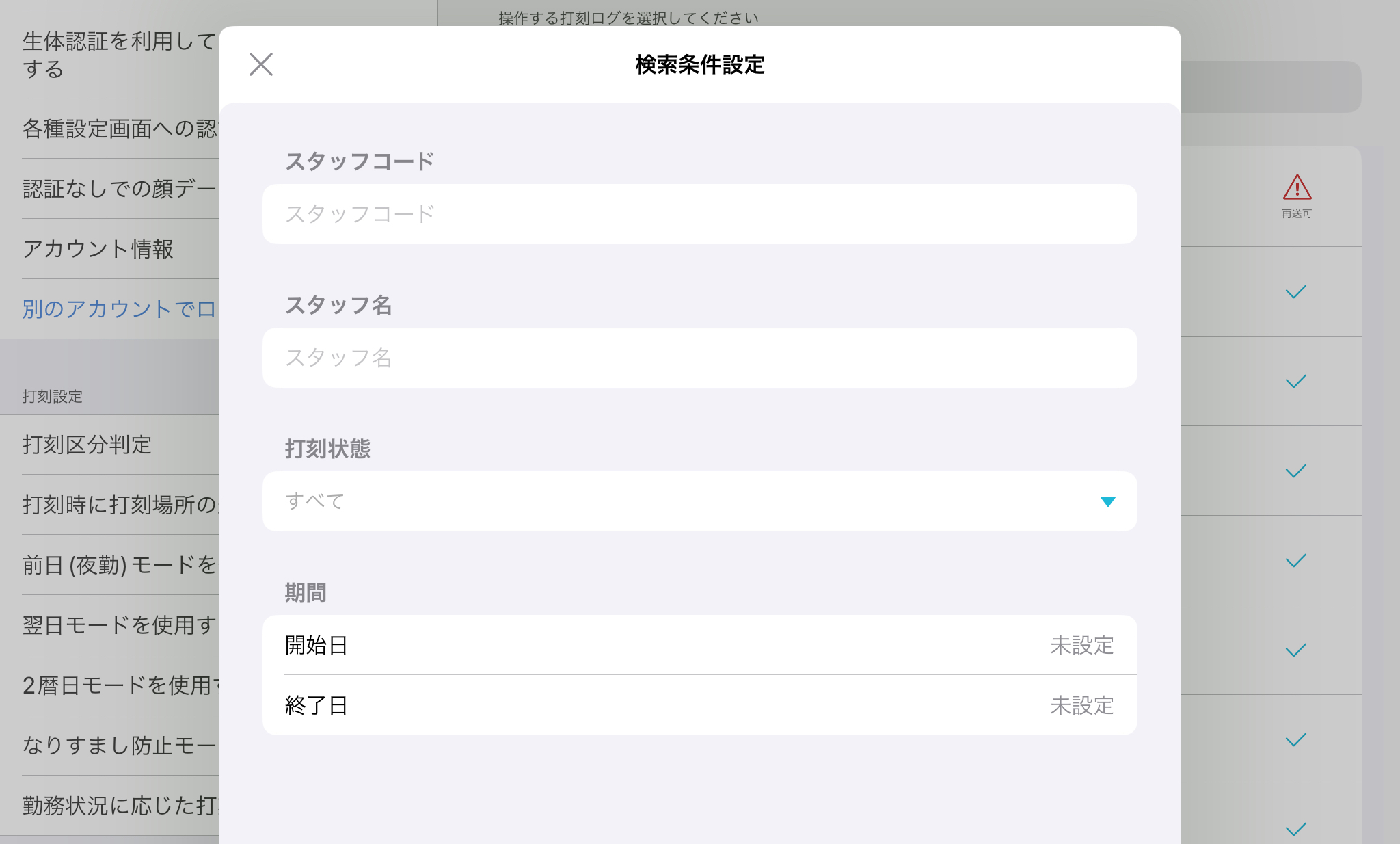 検索条件設定では、フリーワード検索よりも詳細な情報を指定して打刻ログを絞り込めます。