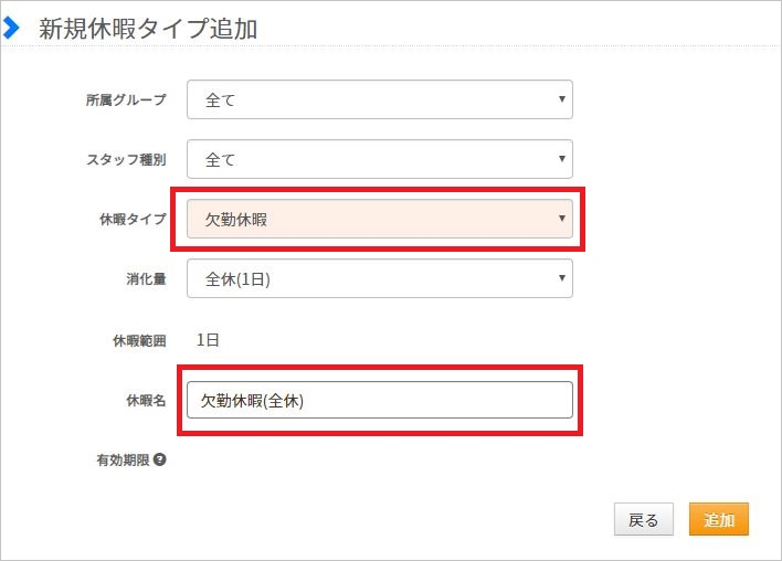2. 休暇タイプ設定で欠勤休暇を作成する