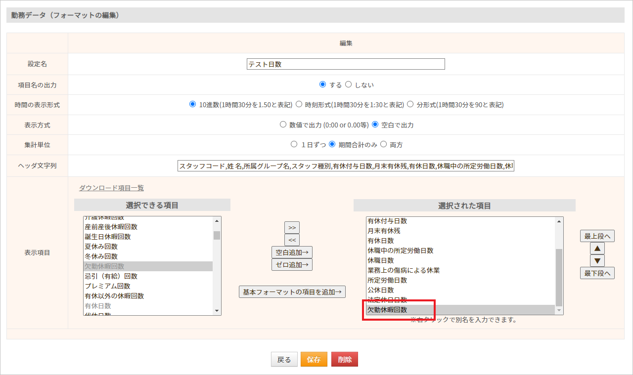 フォーマットには項目「欠勤休暇回数」もしくは「欠勤休暇日数」を追加してください。