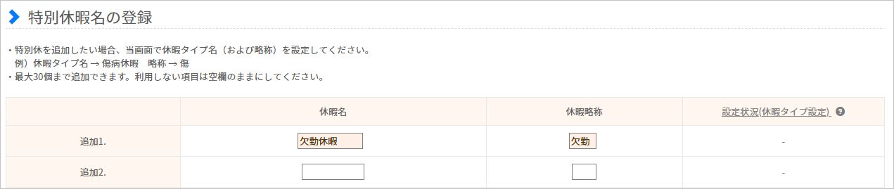 「特別休暇名の登録」画面で、欠勤休暇の作成に使う休暇タイプ名を登録します。