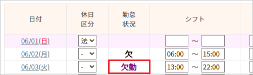 項目「欠勤回数」は「シフトがあり、かつ打刻が無い日(=欠勤)の回数」を出力するものなので、