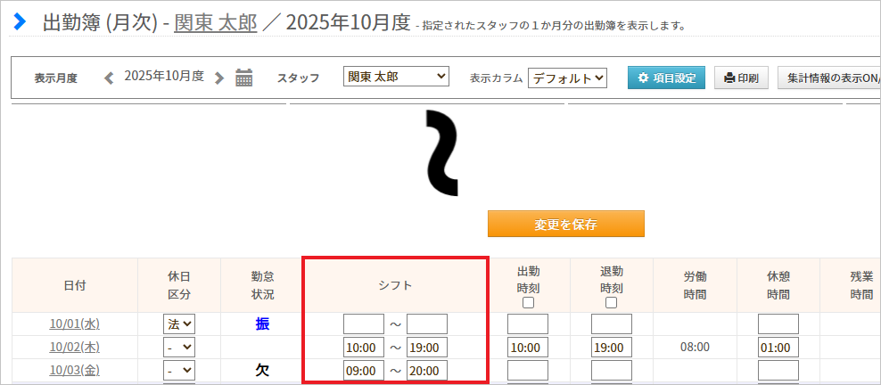 「シフト」欄に表示されているシフト開始時刻・終了時刻を削除し、「変更を保存」ボタンクリックして