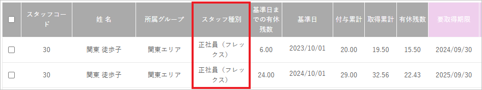 例)とあるスタッフのスタッフ種別を、2023年までは「課長」、2024年からは「正社員(フレックス)」で設定した場合 〇残業状況一覧 検索条件で指定した「表示年月」当時のスタッフ種別を表示します。 〇有休取得管理(年休管理簿) 有休取得管理画面では、現在のスタッフ種別を表示します。 年休管理簿には、基準日時点でのスタッフ種別を表示します。 |