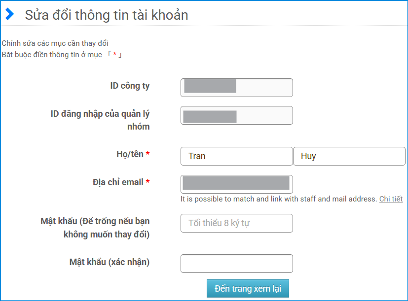 Màn hình [Thay đổi thông tin tài khoản quản trị viên] sẽ được mở. Nếu thực hiện thay đổi thông tin, hãy nhấn [Đến trang xem lại] để lưu.