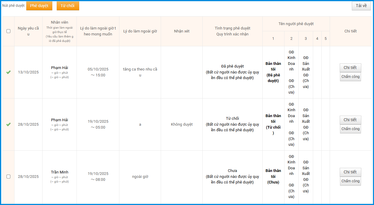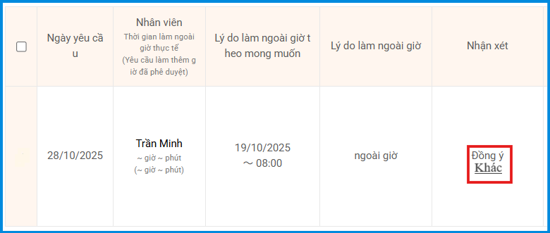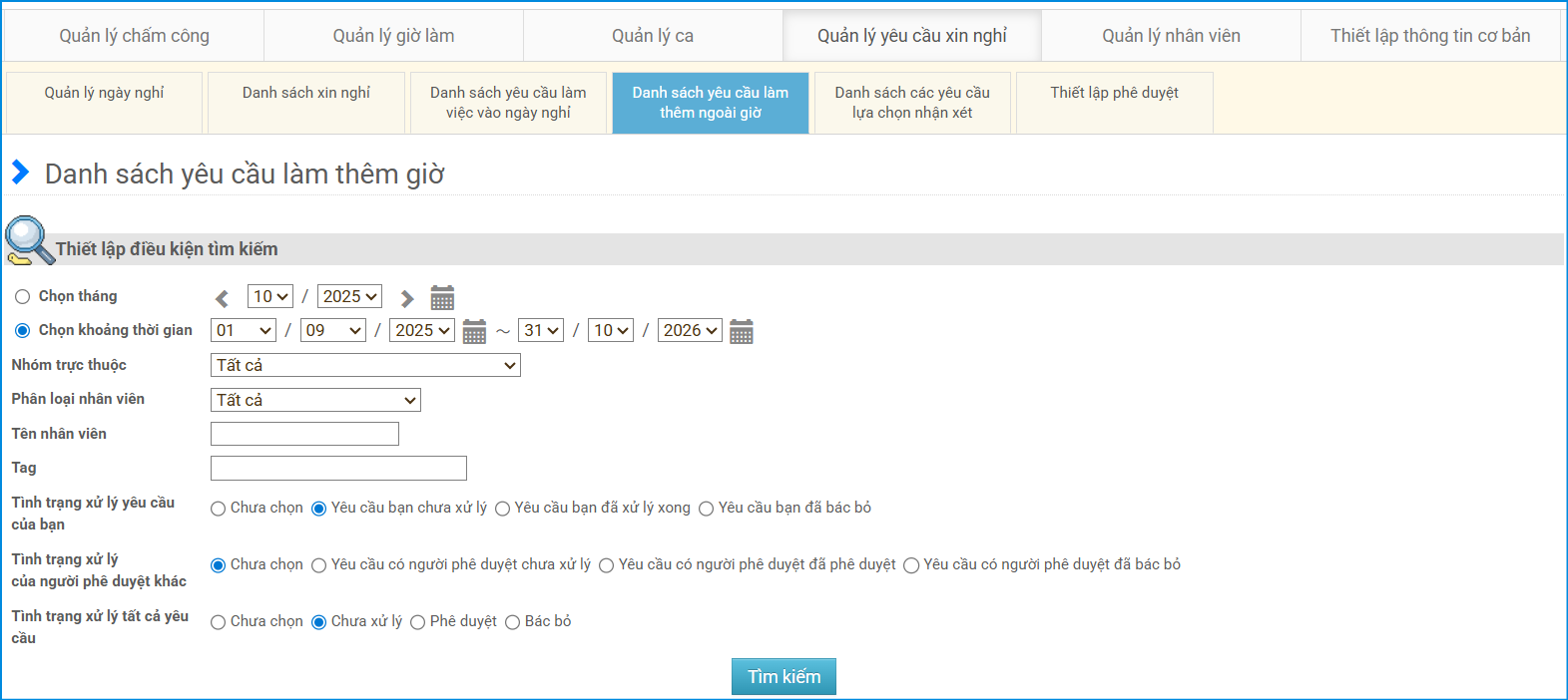Tại mục Danh sách yêu cầu làm thêm ngoài giờ, có thể phê duyệt hoặc từ chối các đơn làm thêm do nhân viên gửi lên. Ngoài ra, cũng có thể lọc và tìm kiếm đơn xin làm thêm theo các điều kiện cụ thể (ví dụ: theo tên nhân viên, thời gian, trạng thái phê duyệt,...).