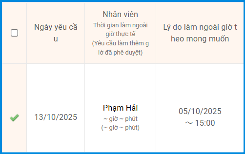 Ngay cả khi yêu cầu được phê duyệt, thời gian làm thêm được ghi trong yêu cầu không tự động tính là giờ làm thêm. Tổng giờ làm thêm thực tế sẽ được tính toán dựa trên thiết lập thời gian làm việc cố định/ thêm giờ/ ca đêm trong hệ thống.
