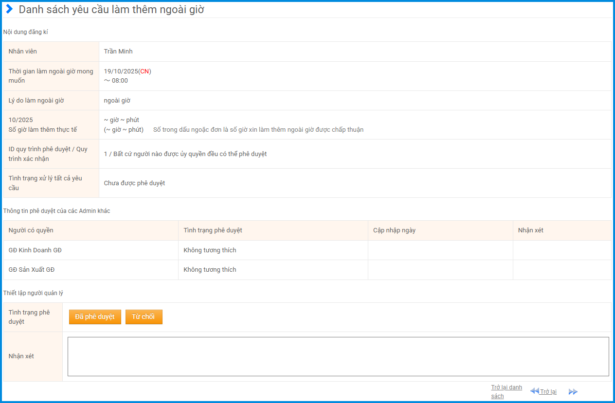 Lưu ý: Việc phê duyệt đơn xin làm thêm sẽ tuân theo quy trình phê duyệt đã được thiết lập trong phần Thiết lập phê duyệt.