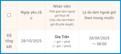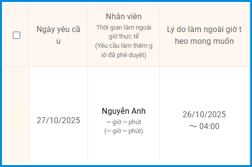 | Nhân viên / Thời gian làm ngoài giờ thực tế (yêu cầu làm thêm giờ đã phê duyệt) | Người gửi yêu cầu |