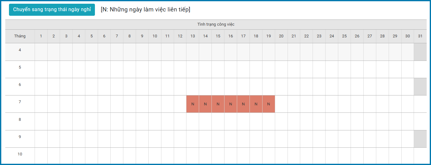 Nếu có tình trạng làm việc liên tục, hệ thống sẽ hiển thị ký tự [N] cùng màu cảnh báo tại ô ngày tương ứng.