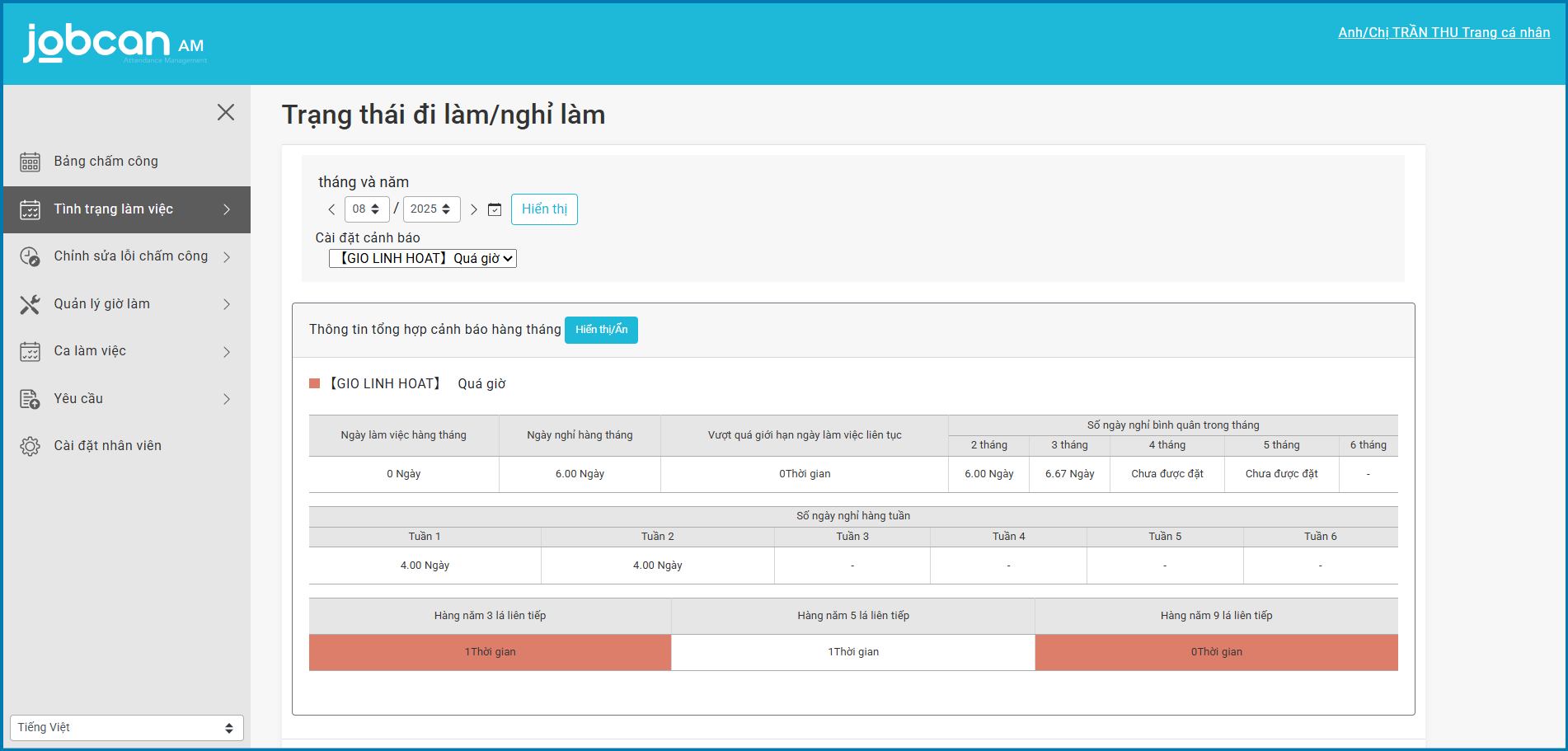 Tại trang Trạng thái đi làm/nghỉ làm, dữ liệu chấm công sẽ được tổng hợp dựa theo Cài đặt cảnh báo quy tắc làm việc và các dữ liệu liên quan đến số ngày nghỉ cũng như số ngày làm việc liên tục sẽ được hiển thị.