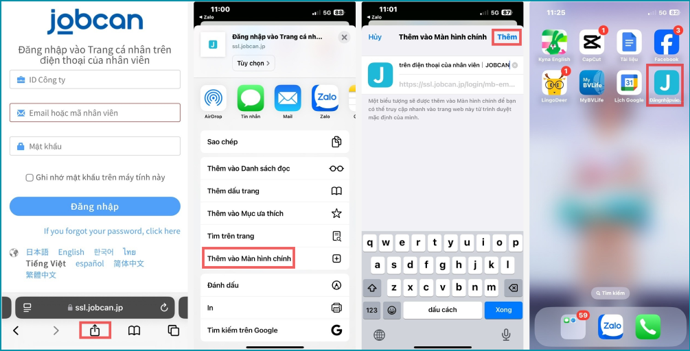 Trên iPhone, có thể ghim ứng dụng trình duyệt Jobcan giống như 1 ứng dụng qua app bằng cách thêm trang cá nhân vào màn hình chính sau khi đăng nhập.