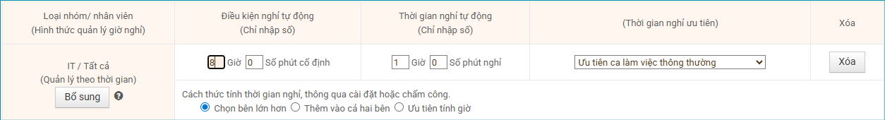 Hệ thống sẽ so sánh giờ nghỉ theo nghỉ tự động và giờ nghỉ theo chấm công, sau đó chọn giá trị lớn hơn để làm giờ nghỉ.