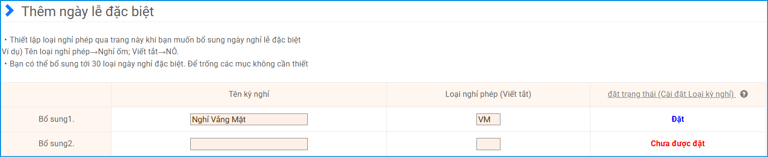 Tại màn hình thêm ngày nghỉ đặc biệt, hãy nhập và lưu tên loại kỳ nghỉ sẽ dùng cho việc tạo nghỉ vắng mặt.