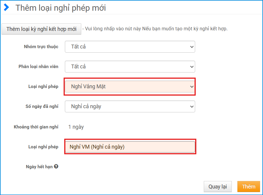 Tại màn hình cài đặt loại kỳ nghỉ, tiến hành tạo mới loại nghỉ nghỉ vắng mặt.