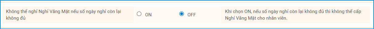 3. Tắt (OFF) tùy chọn “Không cho phép sử dụng nghỉ vắng mặt khi số ngày nghỉ còn lại không đủ”