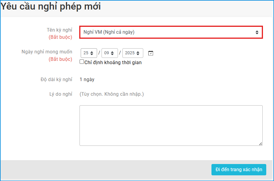 Trong mục loại nghỉ phép, chọn loại nghỉ đặc biệt mà đã đăng ký ở bước 1.