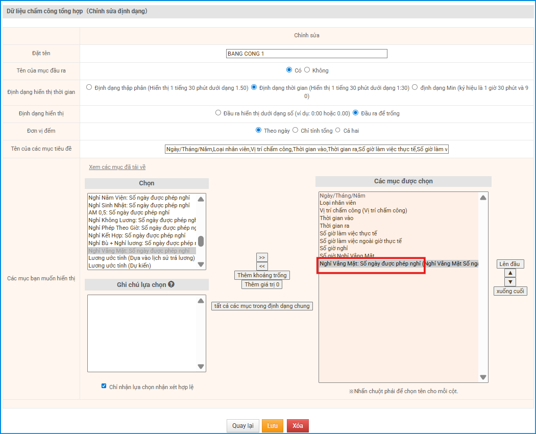 Trong bảng chấm công, phần tình trạng làm việc sẽ hiển thị tên viết tắt mà bạn đăng ký tại đây → Vì vậy, hãy đặt tên sao cho dễ nhận biết đó là nghỉ vắng mặt (ví dụ: vm,…).