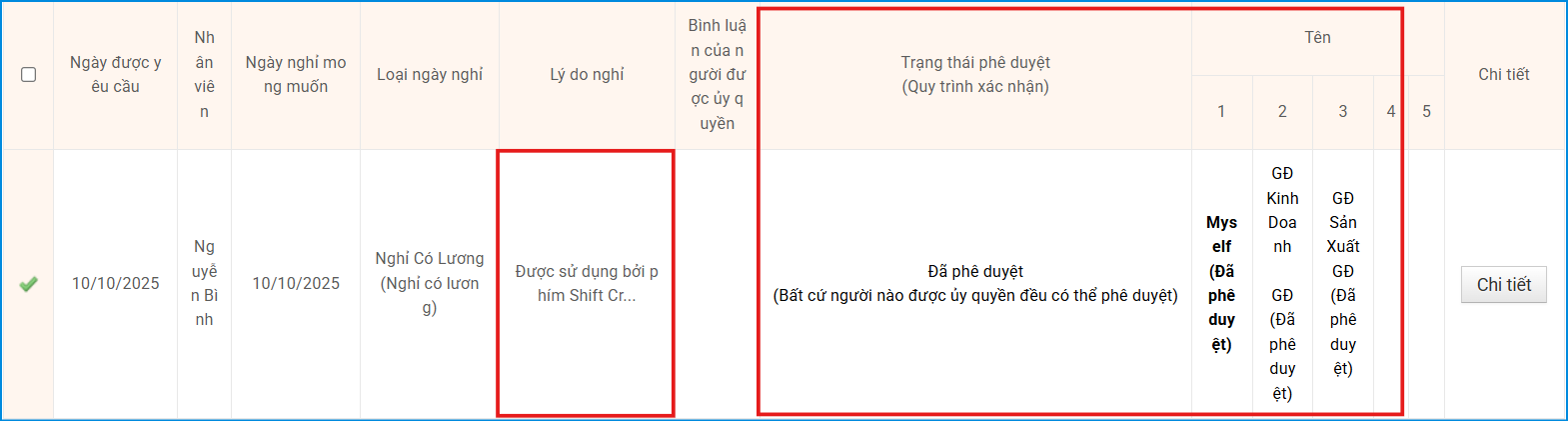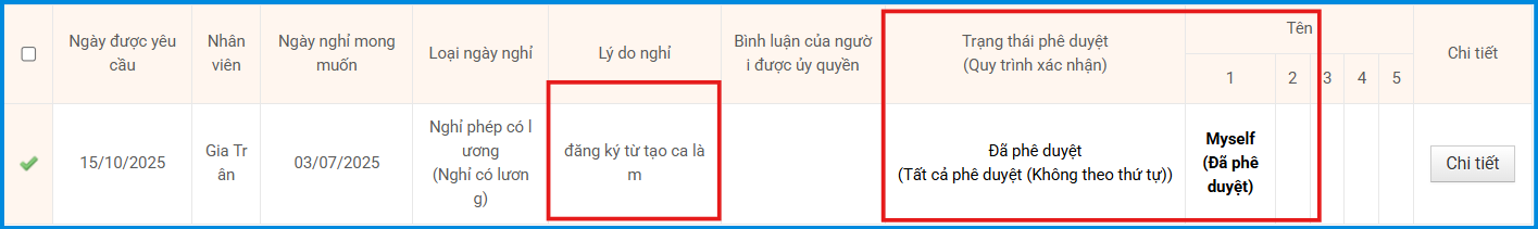 A. Nếu không phải là nhân viên gửi đơn mà quản trị viên trực tiếp sử dụng tính năng “Sử dụng nghỉ phép” hoặc thực hiện từ Bảng ca làm việc, hệ thống sẽ tự động tạo ra một đơn nghỉ phép đã được duyệt.