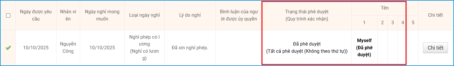 Tự động được phê duyệt, Nghỉ phép, Phê duyệt” / “Duyệt, Đơn xin nghỉ phép