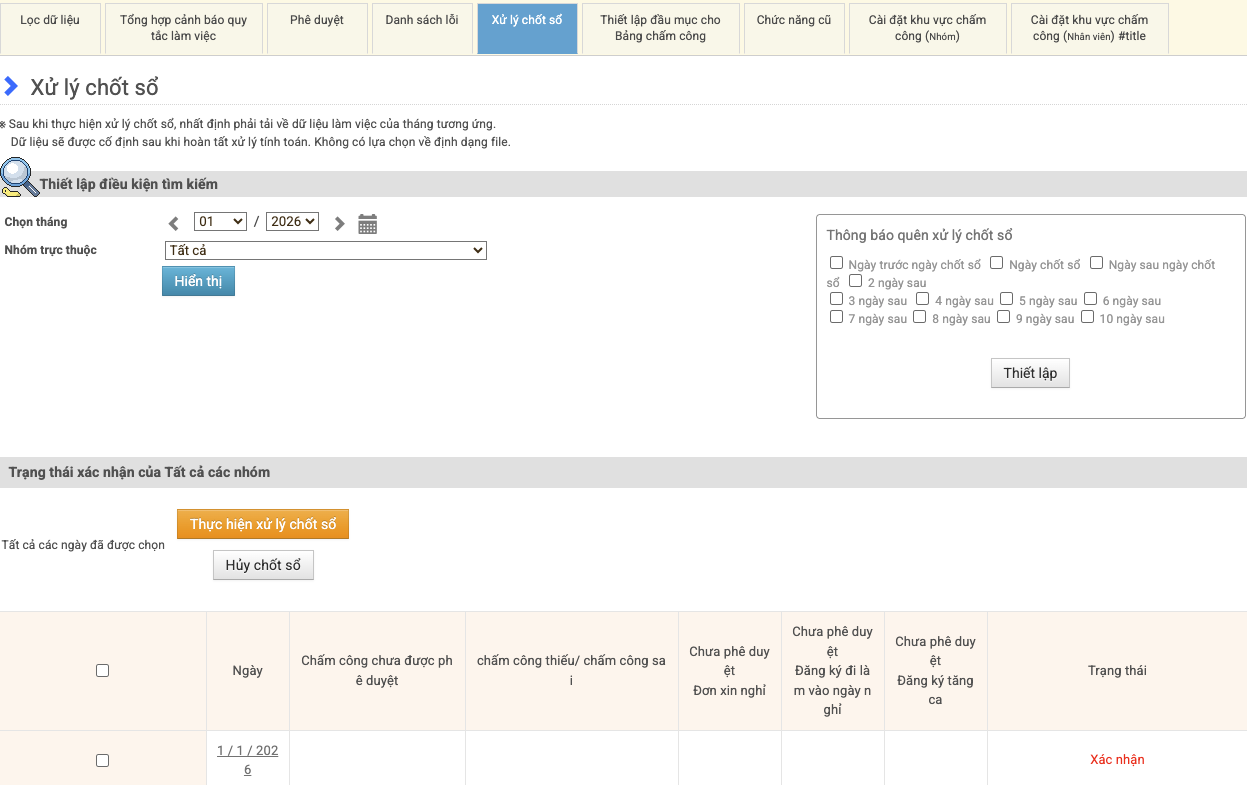 Quản lý chấm công → Xử lý chốt sổ