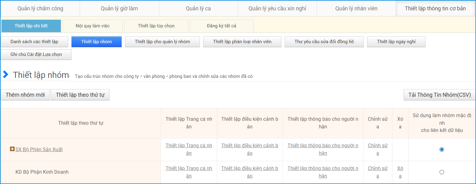 Nhiều thiết lập như Quy định làm việc hay Tự động cộng ngày nghỉ phép có thể được tùy chỉnh riêng cho từng Nhóm. Ngoài ra, Nhóm chính và Nhóm phụ cũng có thể được dùng làm Địa điểm chấm công.