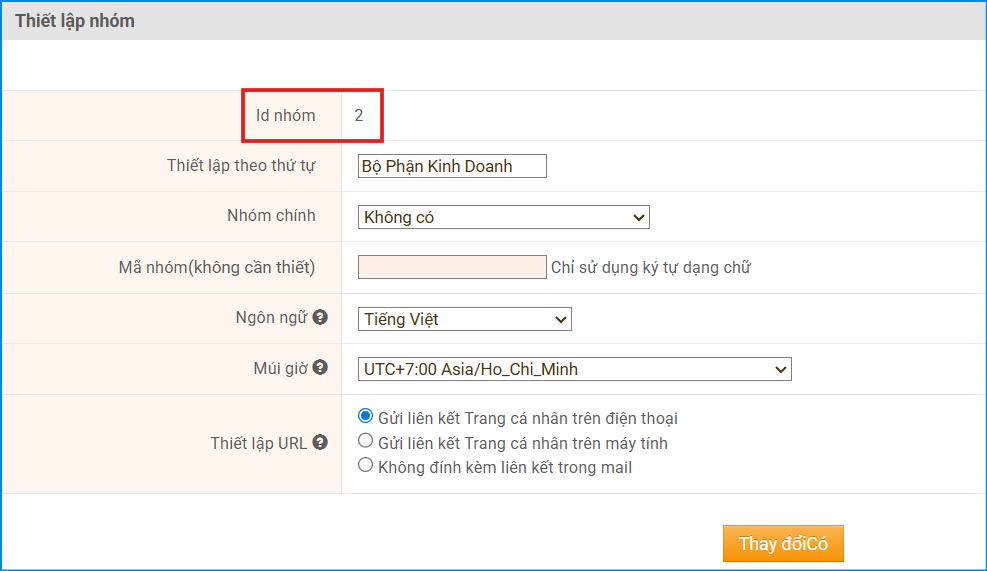 Nhóm trực thuộc; Nhóm chính; Nhóm phụ; Nhóm cấp trên; Nhiều địa điểm; Phòng ban; Điều chuyển; Mã nhóm (ID Group)