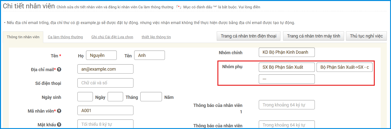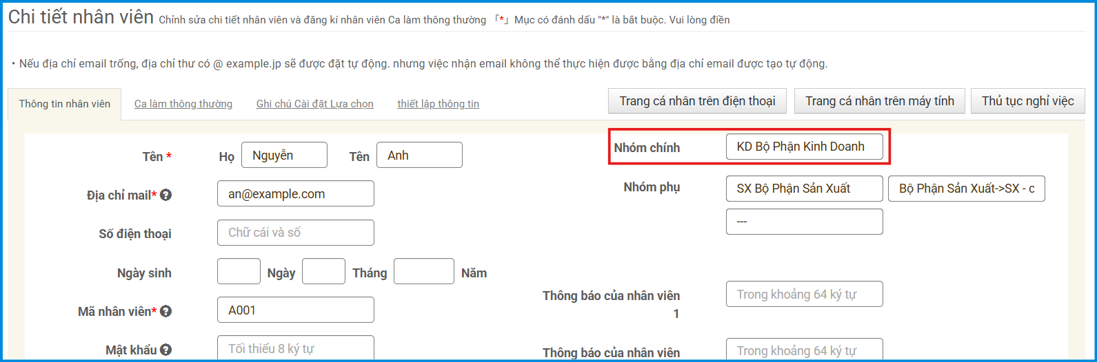 Thiết lập Nhóm chính và Nhóm phụ cho nhân viên tại Chi tiết nhân viên. Mỗi nhân viên chỉ có thể thuộc một Nhóm chính, nhưng có thể tham gia nhiều Nhóm phụ.