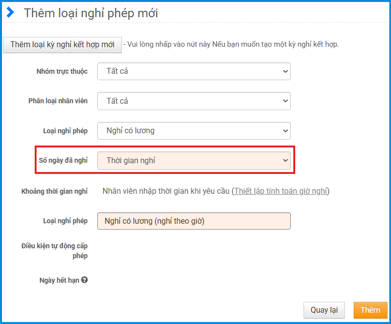 Lưu ý: Không thể áp dụng “thời gian nghỉ (theo giờ)” cho loại nghỉ bù hoặc nghỉ hoán đổi. Tùy chọn này chỉ khả dụng với nghỉ có lương hoặc nghỉ đặc biệt.