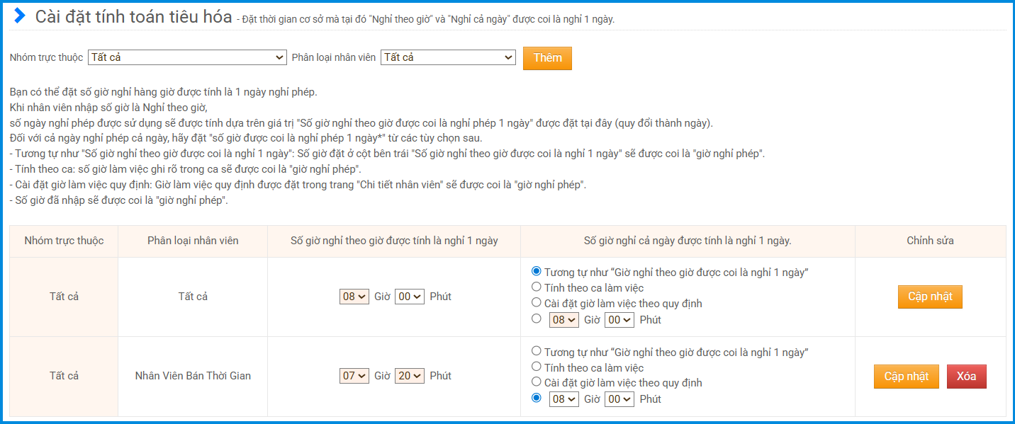 Cài đặt tính toán tiêu hóa có thể thực hiện riêng cho từng nhóm/ loại nhân viên.