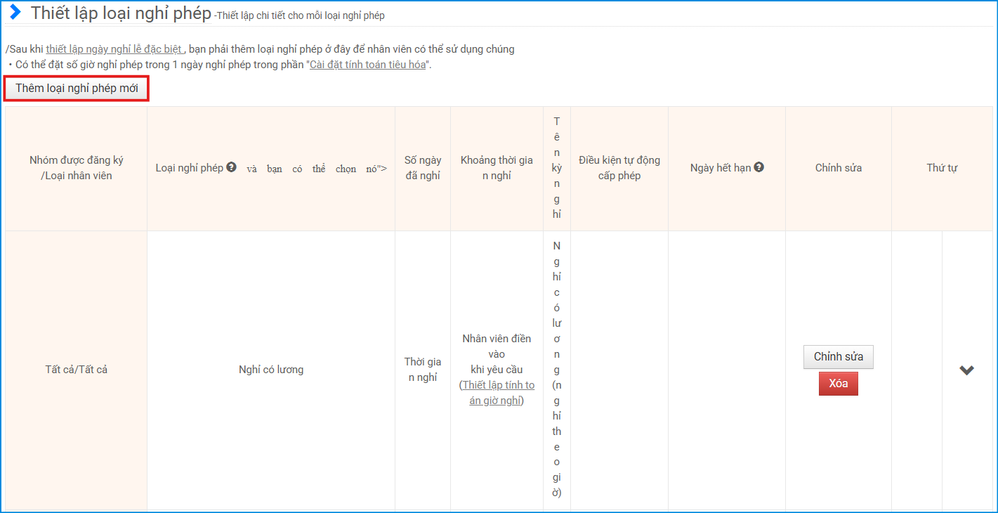 Sau khi hoàn tất thiết lập, nhấn [Thêm] để lưu. Loại nghỉ phép mới sẽ được tạo.
