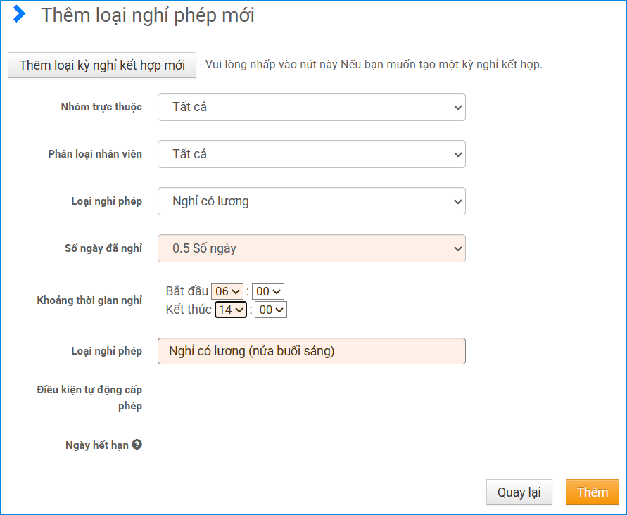 Lưu ý: Mỗi loại nghỉ phép chỉ có thể thiết lập một phạm vi nghỉ. Vì vậy, nếu cần cả hai loại (nghỉ buổi sáng và nghỉ buổi chiều), cần tạo hai loại riêng, mỗi loại có “Số ngày đã nghỉ: 0.5 ngày”.