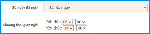 Mục này chỉ có thể cài đặt khi chọn “Số ngày đã nghỉ: từ 0.1 đến 0.9 ngày”. Thiết lập khoảng thời gian nghỉ (buổi sáng, buổi chiều, hoặc theo giờ cụ thể). |