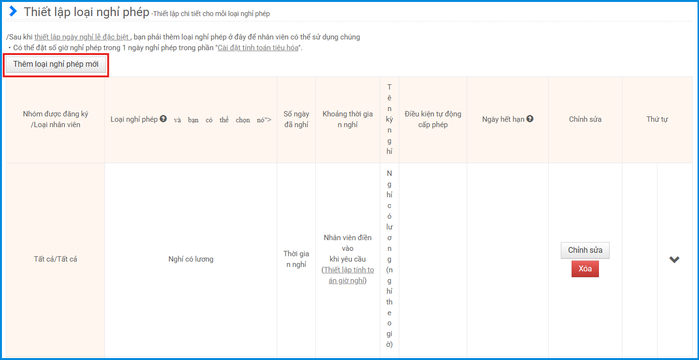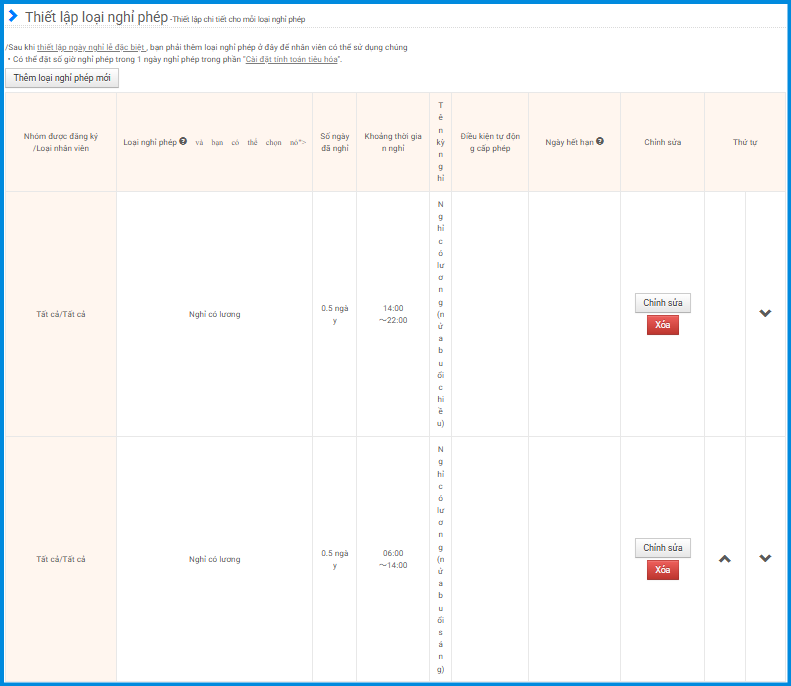 Nếu muốn sử dụng chế độ nghỉ nửa ngày (nghỉ nửa buổi), cần tạo một loại nghỉ phép mới trong phần Thiết lập loại kỳ nghỉ.