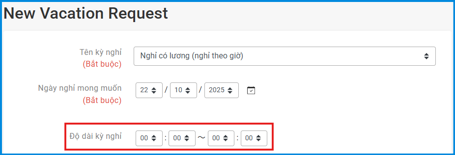 Đối với loại nghỉ phép có mức nghỉ “theo giờ”, người gửi đơn tự chọn phạm vi thời gian nghỉ khi thực hiện đăng ký. Số ngày nghỉ tương ứng sẽ được hệ thống tự động tính toán dựa theo phần “Thiết lập cách tính số ngày nghỉ”.