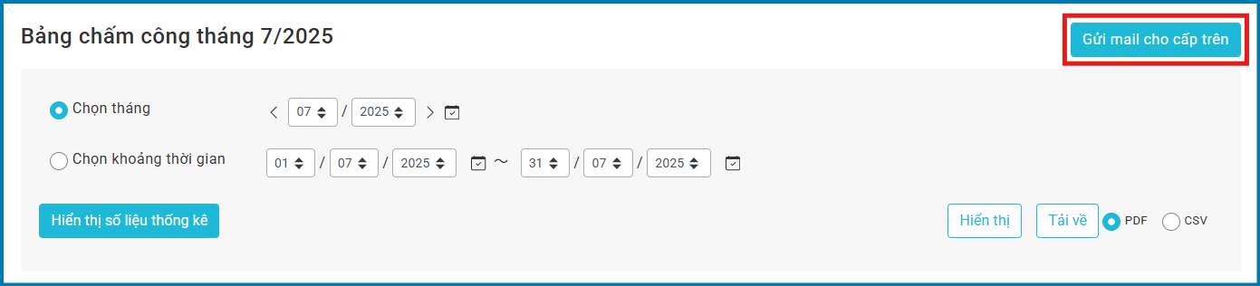 Khi tính năng "Gửi mail cho cấp trên" được thiết lập, nút "Gửi mail cho cấp trên" sẽ xuất hiện trên màn hình Bảng chấm công.