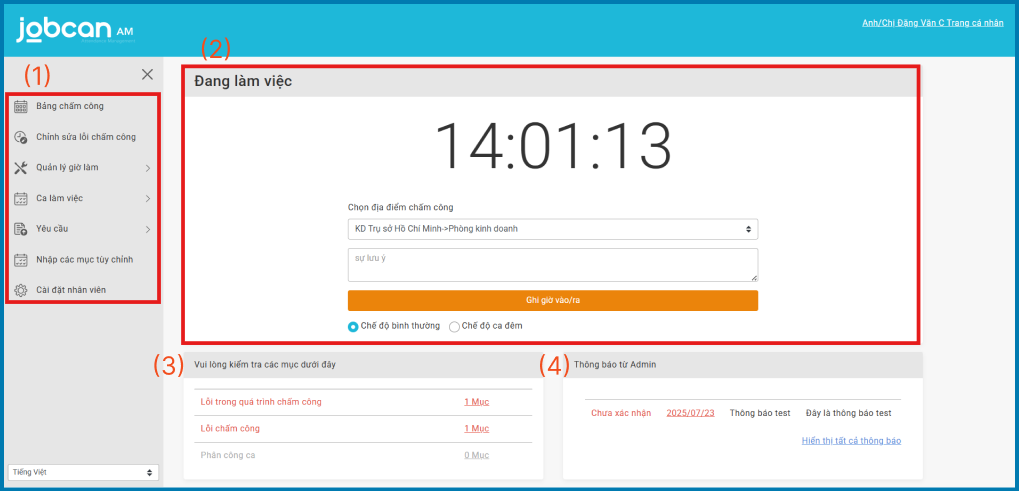 - (2) Màn hình chấm công