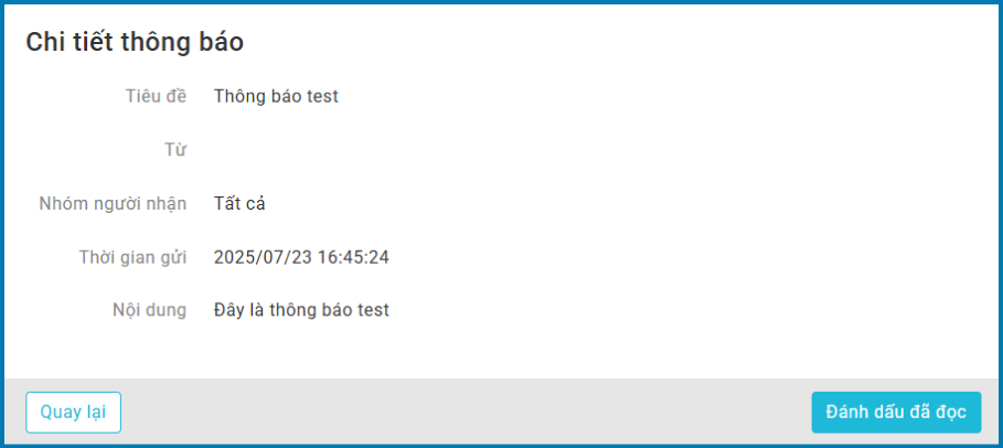 Tại màn hình chi tiết, khi nhấn “Đánh dấu đã đọc”, thông báo sẽ được xem là đã xác nhận.