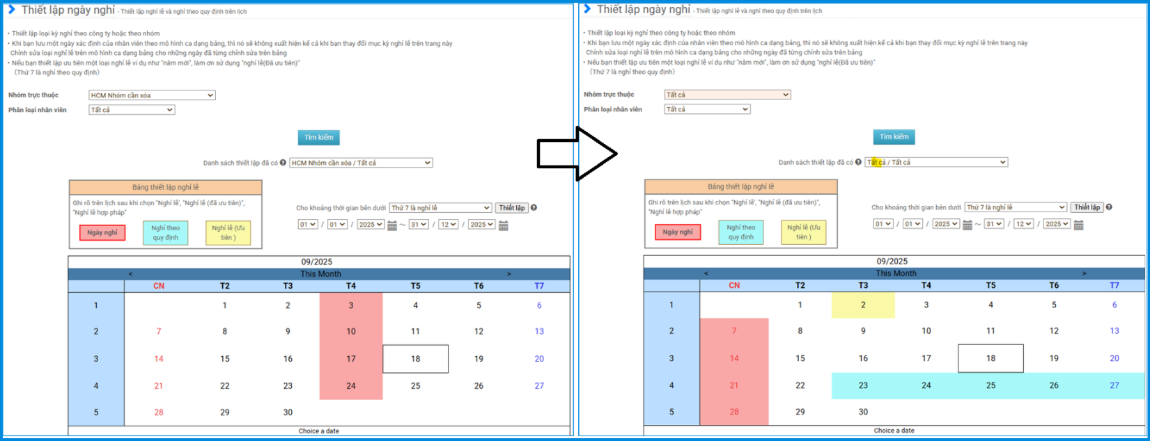 | Cài đặt ngày nghỉ | Ngưng hiệu lực |