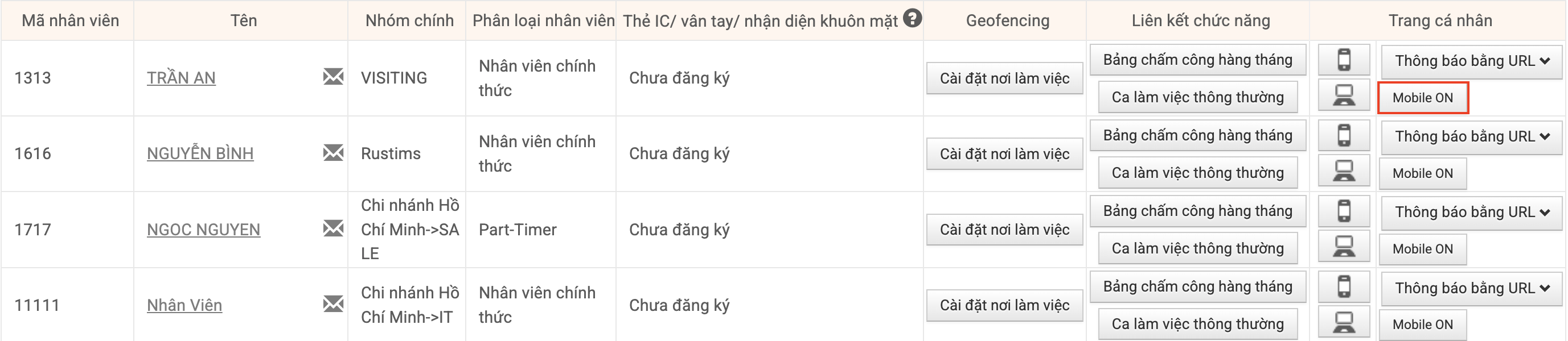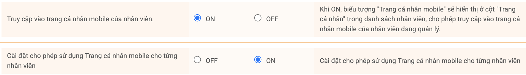"Nhân viên có thể sử dụng trang cá nhân trên di động" đều được bật [ON], sẽ có thể cài đặt quyền sử dụng trang cá nhân trên điện thoại cho từng nhân viên từ danh sách nhân viên.